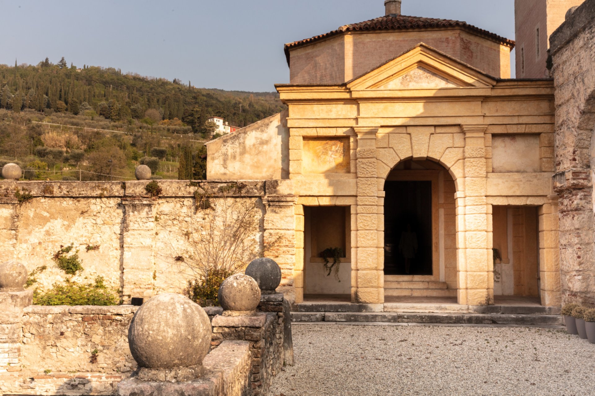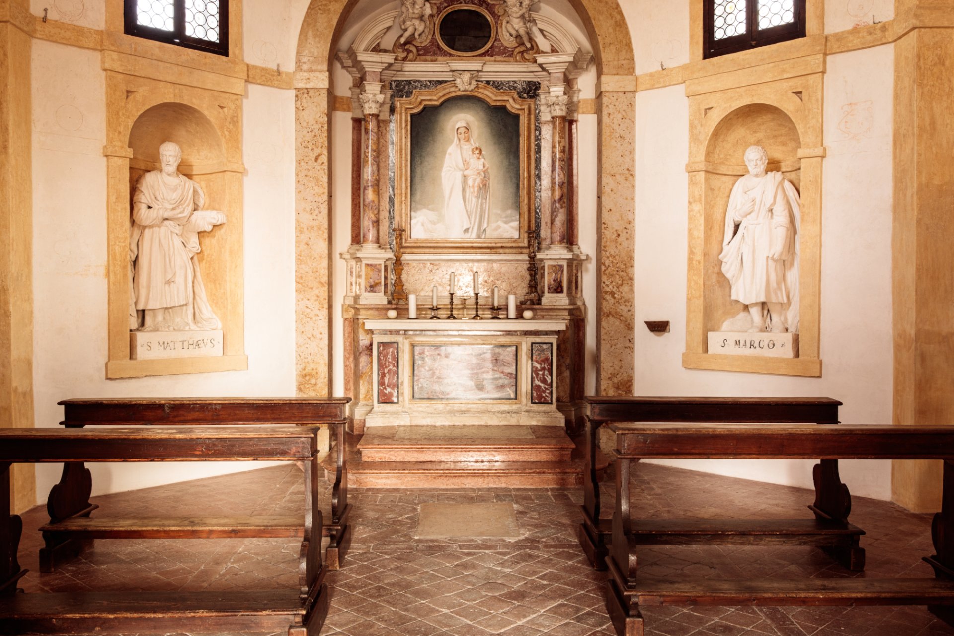 “For the noble Counts Della Torre, Michele built a very beautiful Chapel in the manner of a round temple with an altar in the middle, in their villa of Fumane”. This is how Giorgio Vasari, in his work The Lives of the artists, attributes the Chapel at Villa Della Torre to Michele Sanmicheli, an architect and urban planner who worked mainly in the cities of Verona and Venice. The Chapel has an octagonal plan with irregular sides, the largest of which are occupied by four large apsidal niches containing statues of the four evangelists (Matthew, Mark, Luke and John). It is covered by an almost perfectly hemispherical dome, with a radius measuring some 9 feet, and its segments – devoid of ornaments and moldings – rest directly on the sides of the octagon, without the use of a tholobate (drum). The altar, moved in the eighteenth century to its current position in the apse, was originally placed in the center, as required by the circle of the Spirituali which included Gian Matteo Giberti and Francesco Della Torre.