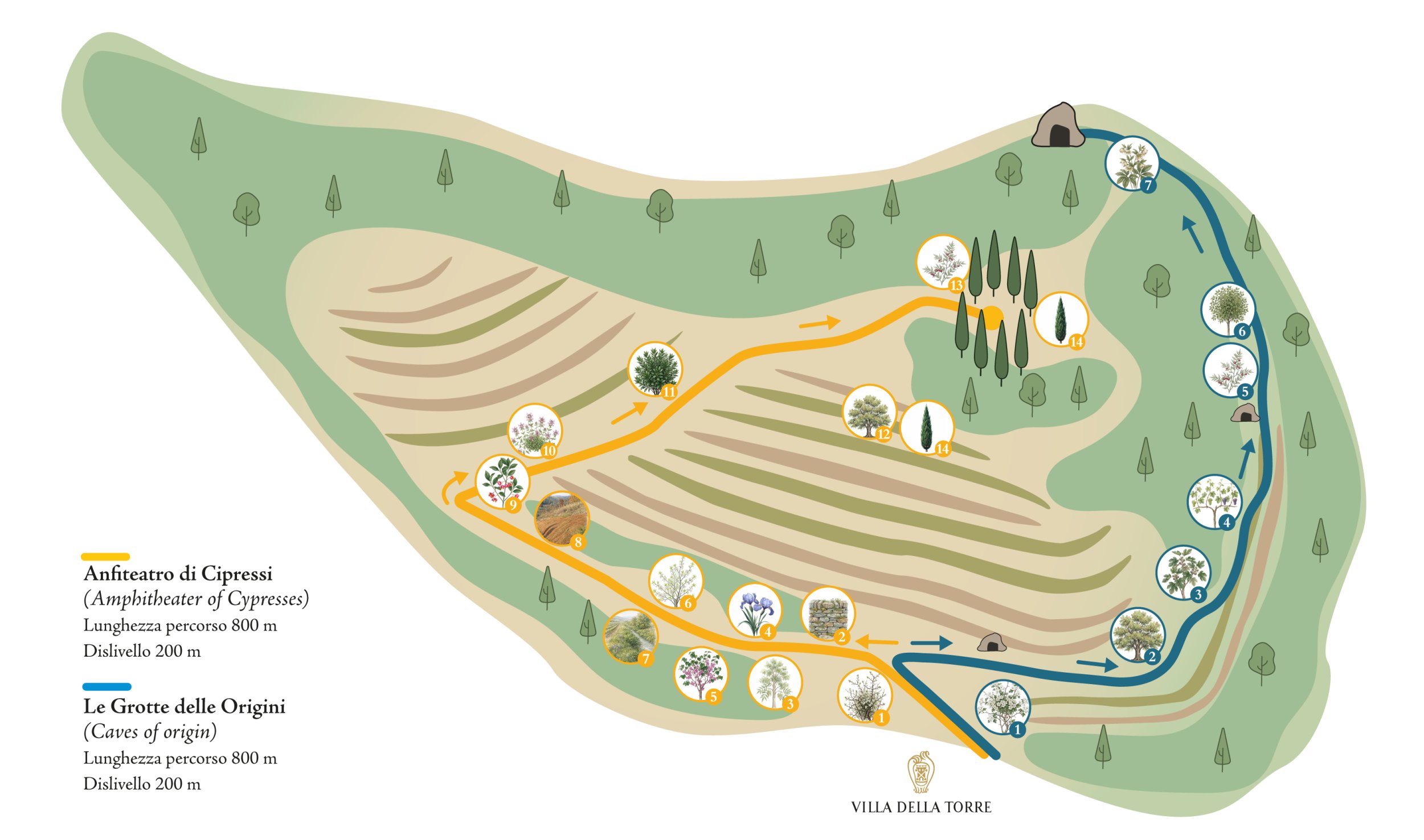 The hill is surrounded by Renaissance walls and for the guest of Villa Della Torre, it represents a wonderful opportunity to visit a nature trail, which is also a magnificent example of biodiversity. The parcel has been planted with guyot training since 2018, the soil is stony, poor in organic matter and rich in limestone, and the grape varietals are mainly Corvina, Corvinone and Rondinella.